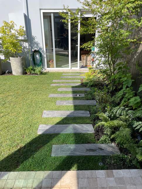 Pensando en el nuevo quincho se creó un tránsito con pastelones de hormigón "tipo durmiente", acompañado de un macizo con especies adecuadas a la orientación sur.
